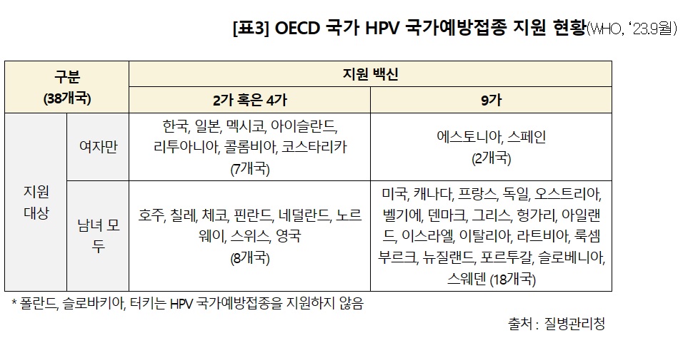 한편, 질병관리청으로부터 제출받은 국정감사 자료 'OECD 국가 HPV국가예방접종 현황'을 보면 한국과 같이 2가 또는 4가 백신을 여성 청소년에만 지원하는 나라는 일본, 멕시코 등 7개국에 불과하고, 미국, 캐나다 프랑스 등 18개국은 남녀 모두를 대상으로 9가 백신을 지원하는 것으로 나타났다.