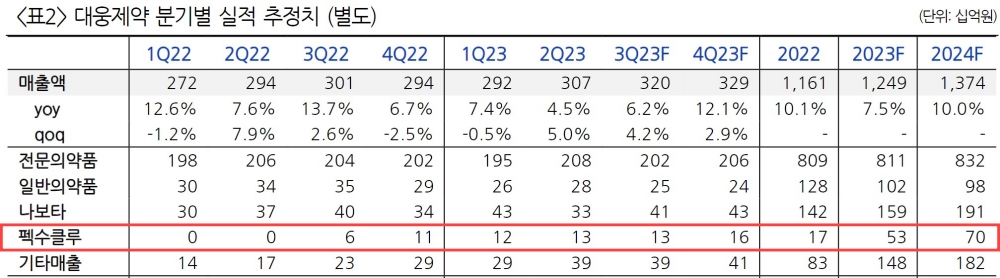 현대차증권은 이어 내년에는 펙수클루 매출액이 700억원까지 늘어날 것으로 예측했다.
