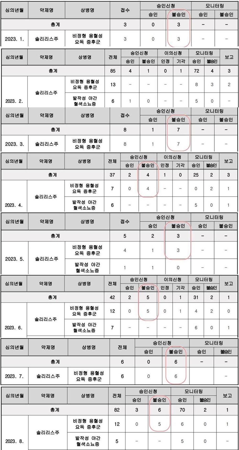 [메디파나뉴스 = 박으뜸 기자] 2018년부터 사전승인 목록에 포함된 '솔리리스(에쿨리주맙)'의 낮은 승인율이 전혀 개선되지 않고 있다.