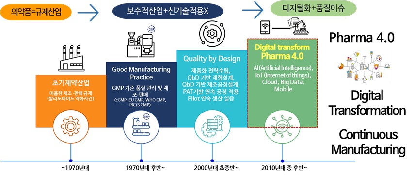 최근에는 전 세계적으로 의약품 제조산업은 Pharma 4.0 도입을 통해 디지털 기반의 제조 및 생산성 향상, 자동화, 시간 및 비용절감 등 공정혁신 중심의 생산고도화에 집중하고 있다.
