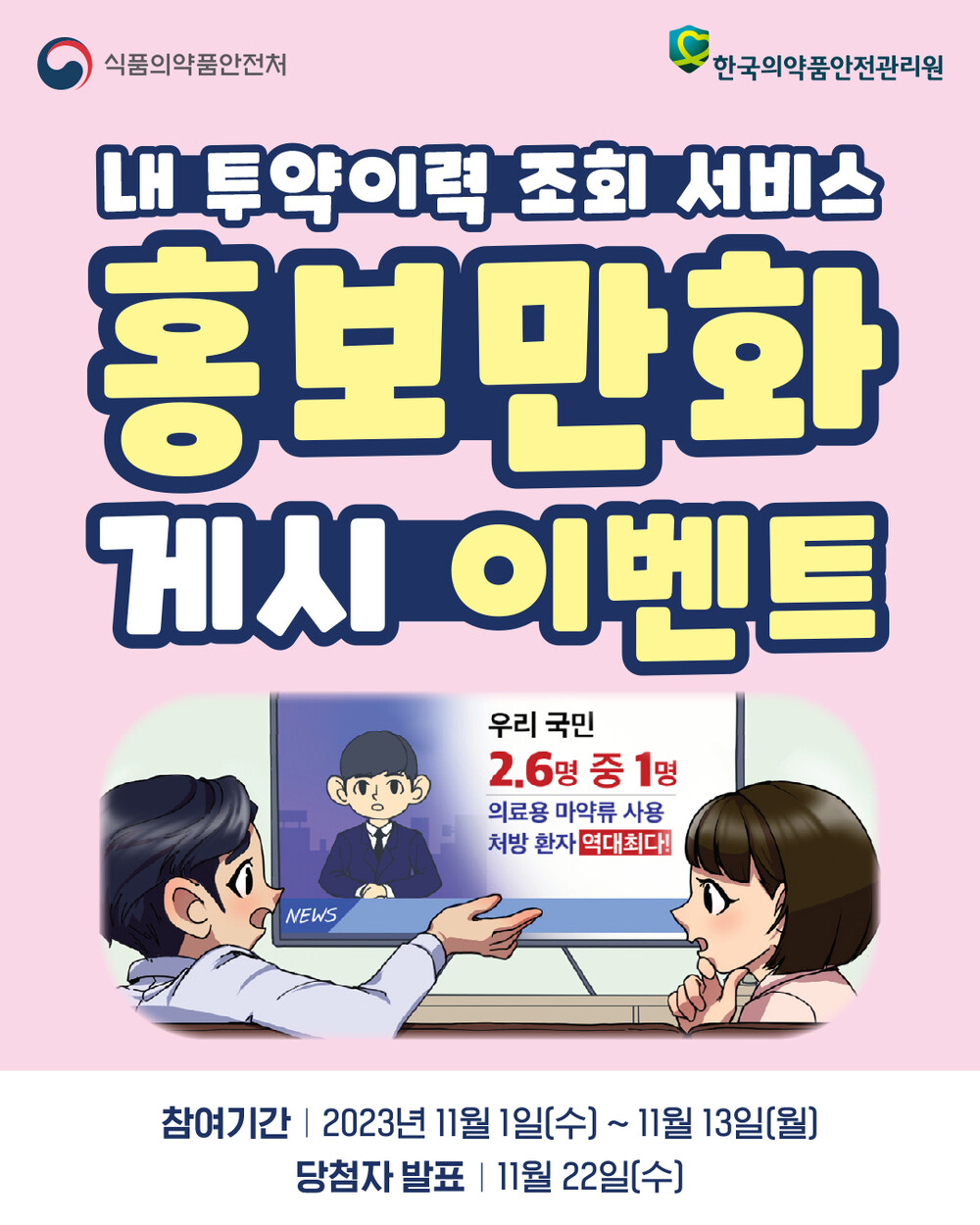 추첨을 통해 200명에게 음료 모바일 상품권이 증정되며, 당첨자 발표는 11월 22일(수) 의약품안전원 인스타그램 계정 게시물로 안내할 예정이다.