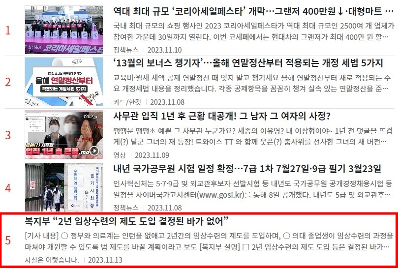 14일 오후 6시 기준 '대한민국 정책브리핑'에 따르면, 13일 보건복지부가 내놓은 임상수련의 제도 관련 보도설명자료가 '많이 본 뉴스' TOP 5 안에 진입했다.