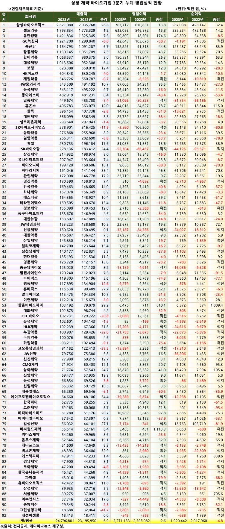 메디파나뉴스가 92개 상장 제약·바이오기업의 연결재무제표 기준 2023년도 3분기 누계 실적을 집계한 결과 매출은 평균 6.9% 증가한 24조7968억 원으로 나타났다. 영업이익은 2.6% 증가한 2조5711억 원, 당기순이익은 4.8% 감소한 1조9204억 원이었다.