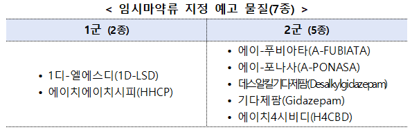 이번에 1군 임시마약류로 지정 예고하는 '1디-엘에스디'는 엘에스디(LSD)와 유사한 성분으로 환각 등 위해성이 있으며, '에이치에이치시피'는 대마 성분인 '테트라하이드로칸나비놀(THC)'와 유사한 구조로 신체적‧정신적 의존성 유발 등, 국민 보건상 위해성이 높은 물질이다.