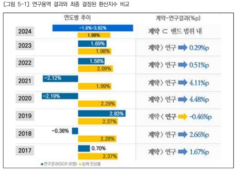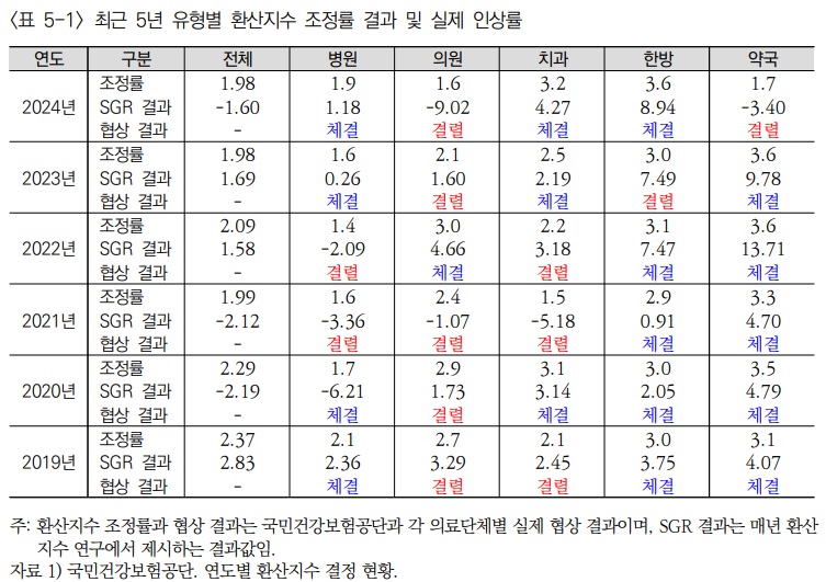 매년 국민건강보험공단은 수가협상 계약을 위해 환산지수 연구를 진행하지만, 그간 환산지수 계약 체결 결과에 따른 실제 수가인상률을 살펴보면 2% 내외였다. 이는 연구용역 결과와 상반되거나 인상률이 더 크게 결정되는 경우가 많았다.