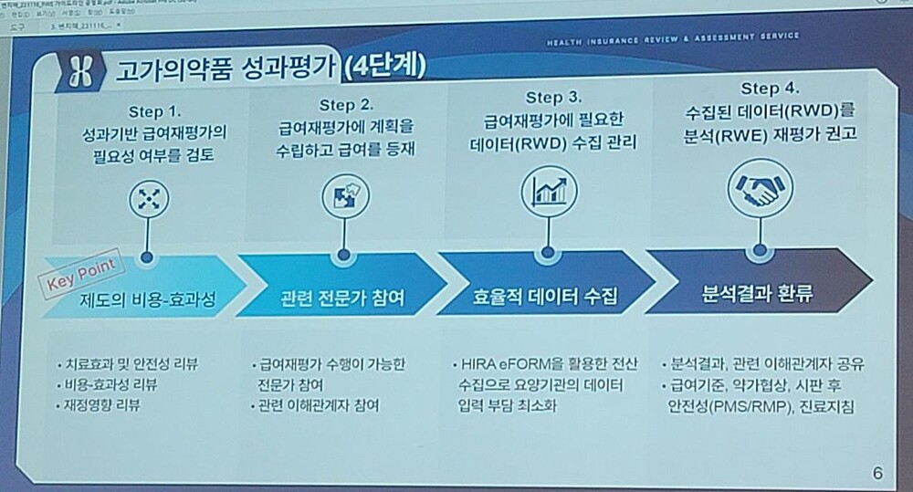 변 위원은 "RWD 활용은 성과기반 급여 재평가의 필요성 여부를 검토해 치료 효과 및 안전성, 비용효과성, 재정 영향을 리뷰하는 것이 핵심이다. 급여 재평가 수행이 가능한 전문가가 참여할 것이며, HIRA eFORM을 활용한 전산 수집으로 요양기관의 입력 부담도 최소화시켰다"고 말했다.