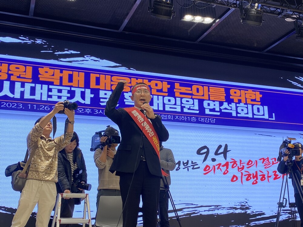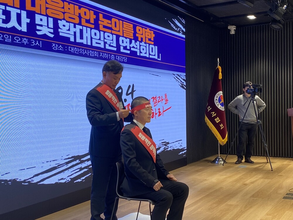 의협 이필수 회장은 26일 전국의사대표자 및 확대임원 연석회의에서 삭발식을 가진 뒤 머리띠를 두르고 투쟁구호를 외쳤다.