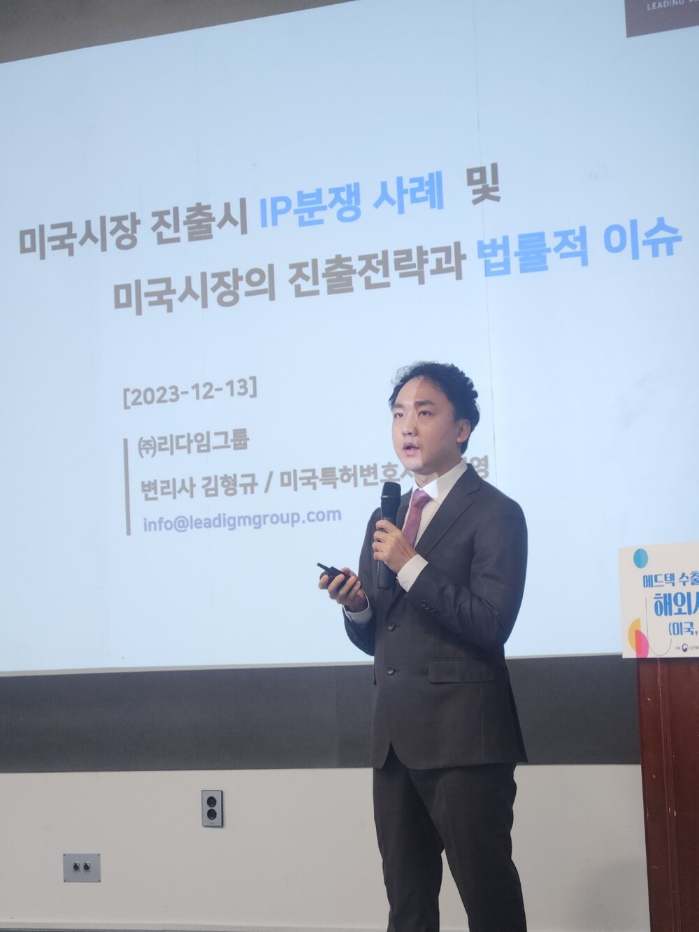 또한 1부 '의료기기 미국시장 진출 및 FDA 해외펀딩 전략' 세션에서는 김형규 리다임그룹 변리사가 '미국시장 진출 시 IP분쟁 사례'를 발표했다.