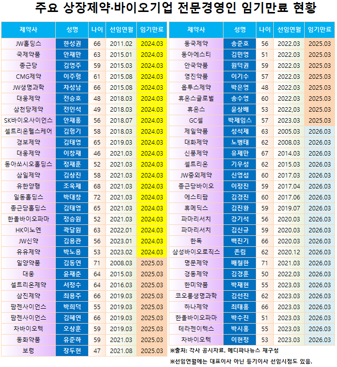 정기주총 시즌인 2024년 3월 임기만료를 앞둔 전문경영인은 ▲JW홀딩스 한성권 ▲국제약품 안재만 ▲종근당 김영주 ▲CMG제약 이주형 ▲JW생명과학 차성남 ▲대웅제약 전승호 ▲삼천당제약 전인석 ▲SK바이오사이언스 안재홍 ▲셀트리온헬스케어 김형기 ▲경보제약 김태영(종근당홀딩스 대표 겸직) ▲대웅제약 이창재 ▲동아쏘시오홀딩스 정재훈 ▲삼일제약 김상진 ▲유한양행 조욱제 ▲일동홀딩스 박대창 ▲종근당홀딩스 김태영(경보제약 대표 겸직) ▲한올바이오파마 정승원 ▲HK이노엔 곽달원 ▲JW신약 김용관 ▲유유제약 박노용 대표 등이다.