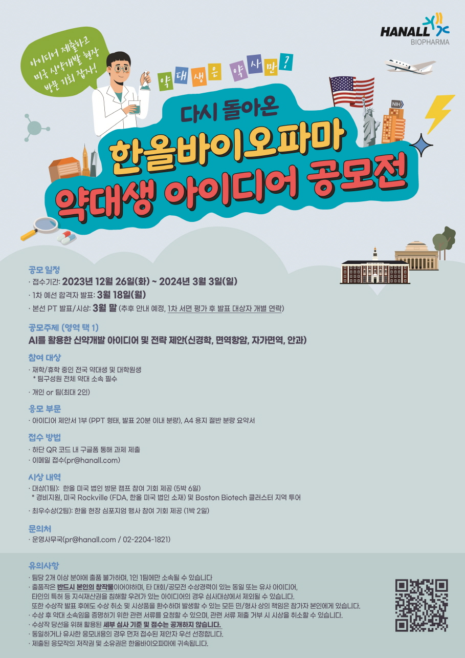 공모기간은 12월 26일부터 2024년 3월 3일까지이며, 공모 자격은 신약개발에 관심 있는 약대에 재학하고 있는 모든 재학생과 휴학생(개인 또는 2인 이내의 팀)이라면 누구나 가능하다. 발표 20분 내외 분량의 자료와 발표 자료를 A4 절반 분량의 요약본으로 접수 페이지를 통해 제출하면 된다.