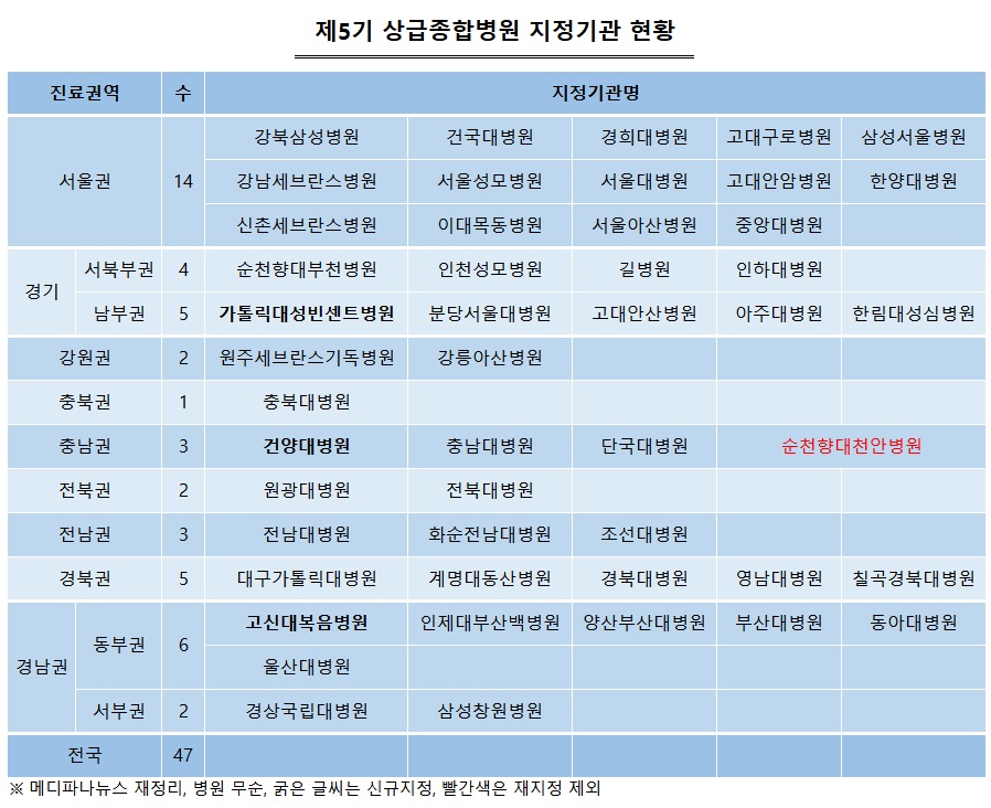 반면 제4기 상급종합병원이었던 순천향대부속천안병원은 제5기에 포함되지 못하고 탈락됐다.
