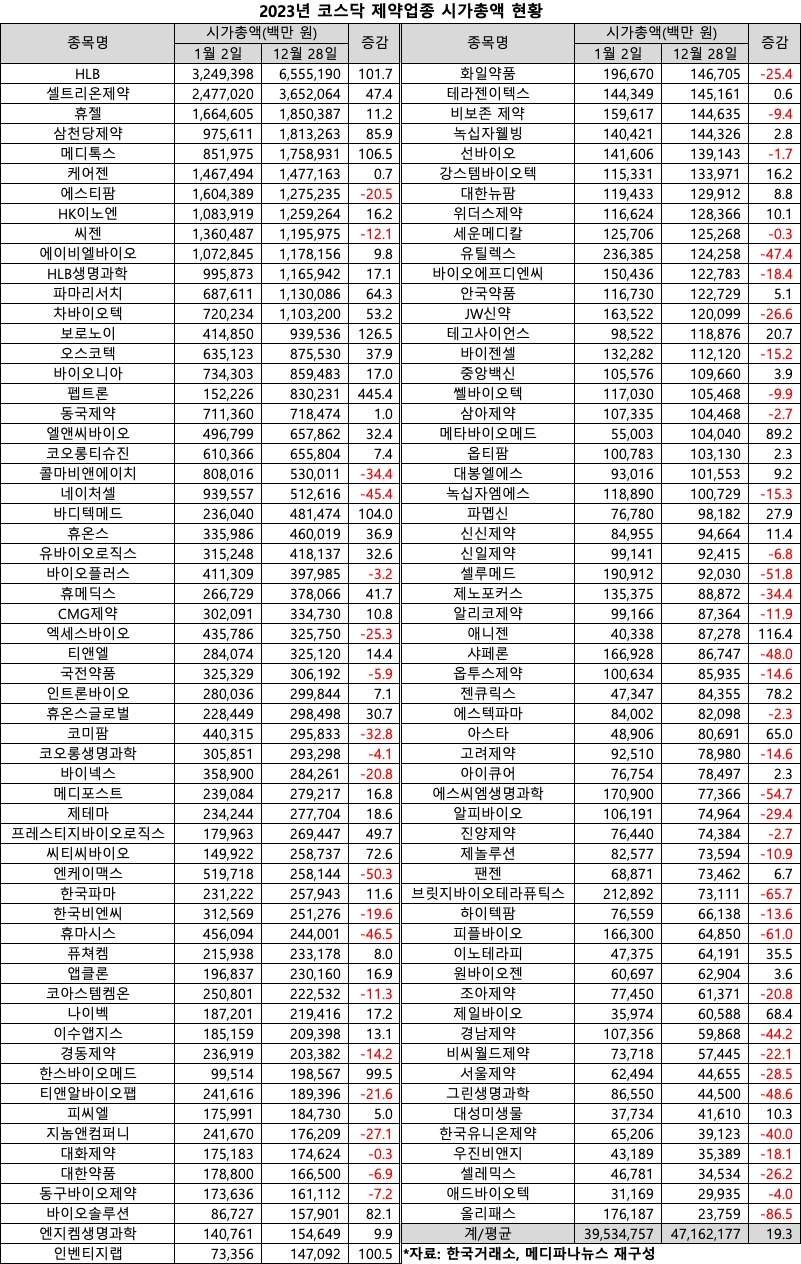 종목별로 살펴보면 HLB가 1월 2일 3조2494억 원에서 12월 28일 6조5552억 원으로 101.7%나 증가해 제약업종 내 시가총액 규모 1위 자리를 지켰다.