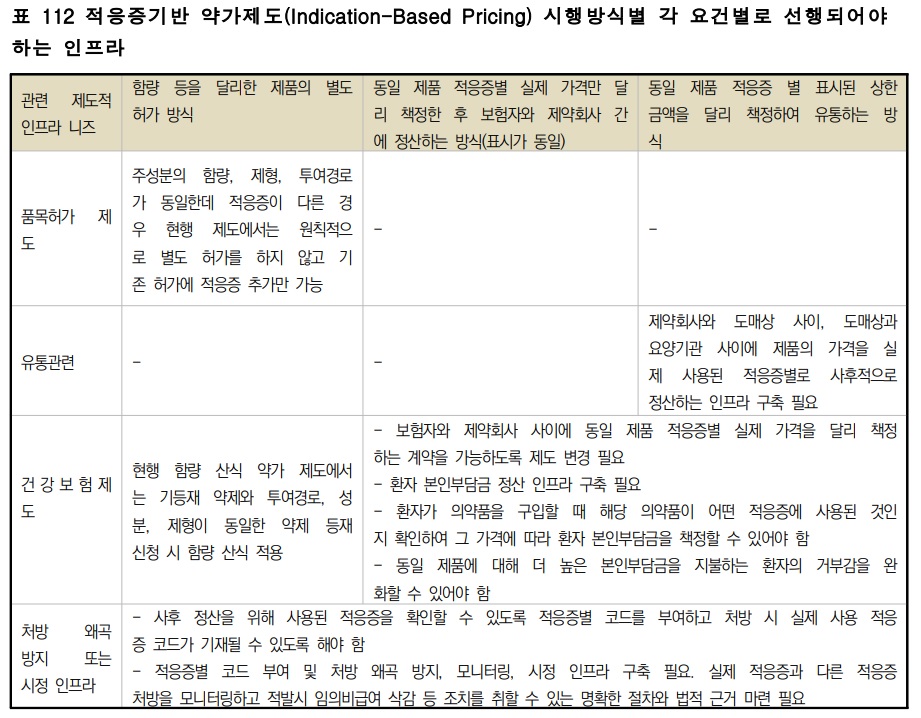 또한 '동일 제품 적응증별 실제 가격만 달리 책정한 후 보험자와 제약회사 간에 정산하는 방식'이나 '동일 제품 적응증 별 표시된 상한금액을 달리 책정해 유통하는 방식' 모두 보험자와 제약사 사이에 동일 제품 적응증별 실제 가격만 달리 책정하는 계약이 가능하도록 제도 변경이 동반돼야 한다.