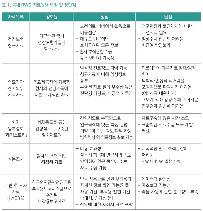 우리나라는 국민건강보험공단 및 건강보험심사평가원의 청구 자료, 의료기관 등의 전자의무기록 자료, 레지스트리, 환자·보건의료인 대상 설문조사 자료, 시판 후 조사 자료 등이 RWD 자료원이 된다.