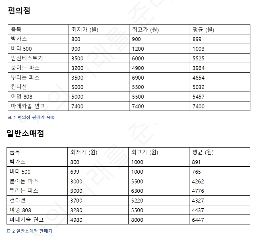 뿌리는 파스의 경우는 점포 및 판매 물건에 따른 가격차이가 컸는데, 품목에 따른 판매가가 편의점 및 소매점이 약국 대비 500원에서 1000원 정도 비싸게 판매를 유지하는 것을 확인했다.