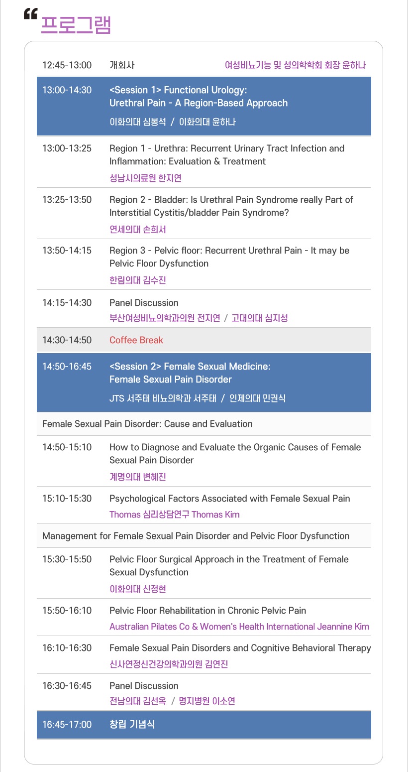 국내에서 여성 환자에 특화된 비뇨기능 문제와 여성 성의학을 함께 다루고 전인적인 관점에서 연구하는 다학제 학회는 여성비뇨기능 및 성의학학회가 최초다.