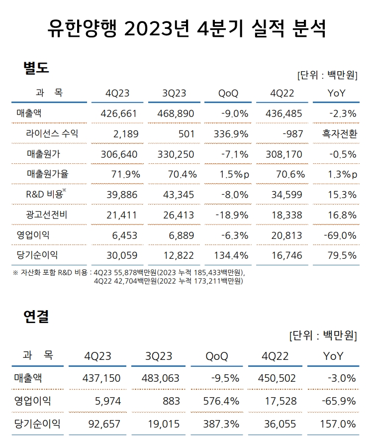이날 진행한 유한양행의 기업설명회(IR) 자료에 따르면, 2023년 4분기 연결재무제표 기준 매출액은 4371억5000만 원으로 전분기 대비 9.5% 감소, 전년동기대비 3.0% 감소했다. 영업이익은 59억7400만 원으로 전분기 대비 536.4% 증가했으나, 전년동기대비로는 65.9% 감소했다.