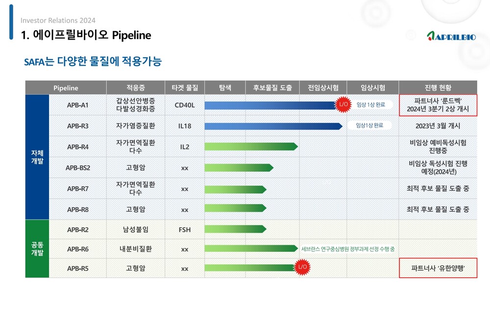 올해 에이프릴바이오는 3분기 중 APB-A1 임상 2상 진입으로 마일스톤 수령, APB-R3의 임상 1상 결과 발표 및 기술수출 타진, 맞춤형 SAFA 플랫폼 개발 및 특허등록을 목표로 업무를 추진하고 있다.