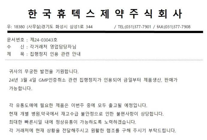 이에 따라 한국휴텍스제약은 각 거래처 영업담당자들에게 "2024년 3월 4일 GMP 인증 취소 관련 집행정지 신청이 인용돼 금일부터 제품생산, 판매가 가능하게 됐다"며 "각 유통도매에 필요한 제품은 이번주 중에 모두 출고될 예정"이라고 안내했다.