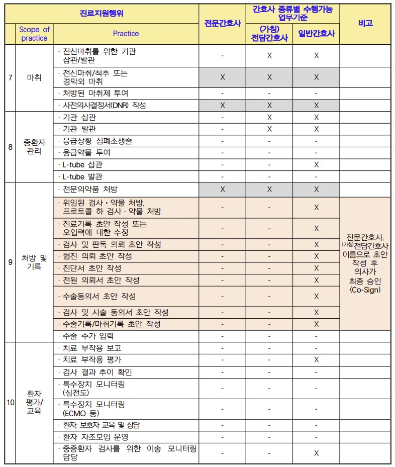 이 중 전문간호사는 ▲전문의약품 처방 ▲대리 수술(집도) ▲X-ray ▲관절강 내 주사 ▲방광조루술 ▲배액관 삽입 ▲골절 내고정물 삽입 및 제거 ▲전신마취·척추 또는 경막외 마취 ▲사전의사결정서 작성 등을 제외한 나머지 진료지원행위를 모두 수행할 수 있다.