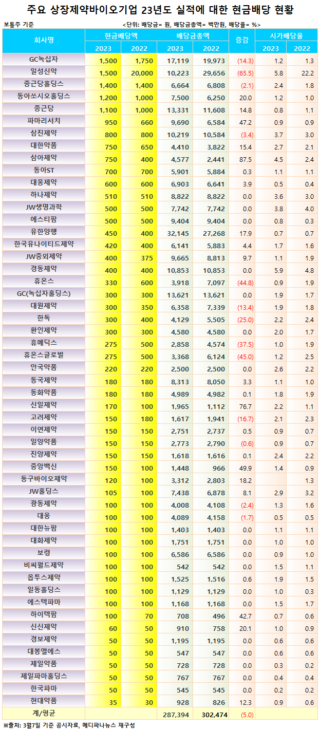 배당금 총액은 유한양행이 321억원 규모로 가장 많았고, GC녹십자 171억, GC(녹십자홀딩스) 136억, 종근당 133억, 경동제약 108억, 일성신약 102억, 삼진제약 102억, 파마리서치 96.9억, JW중외제약 96.6억, 에스티팜 94억, 하나제약 88억, 동국제약 83억, JW생명과학 77억, 동아쏘시오홀딩스 75억, JW홀딩스 74억, 대웅제약 69억, 종근당홀딩스66.6억, 보령 65.8억, 대원제약 63.5억, 한국유나이티드제약 61억, 동아ST 59억 순이다.