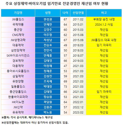 그외 대웅제약 이창재, 동아쏘시오홀딩스 정재훈, 삼일제약 김상진, 유한양행 조욱제, 일동홀딩스 박대창, 종근당홀딩스 김태형, 한올바이오파마 정승원 대표(이상 21년 3월 선임) 등과 HK이노엔 곽달원(22년 1월), JW신약 김용관(22년 12월), 유유제약 박노용 대표(23년 2월 선임)는 2연임에 들어갈 예정이다.
