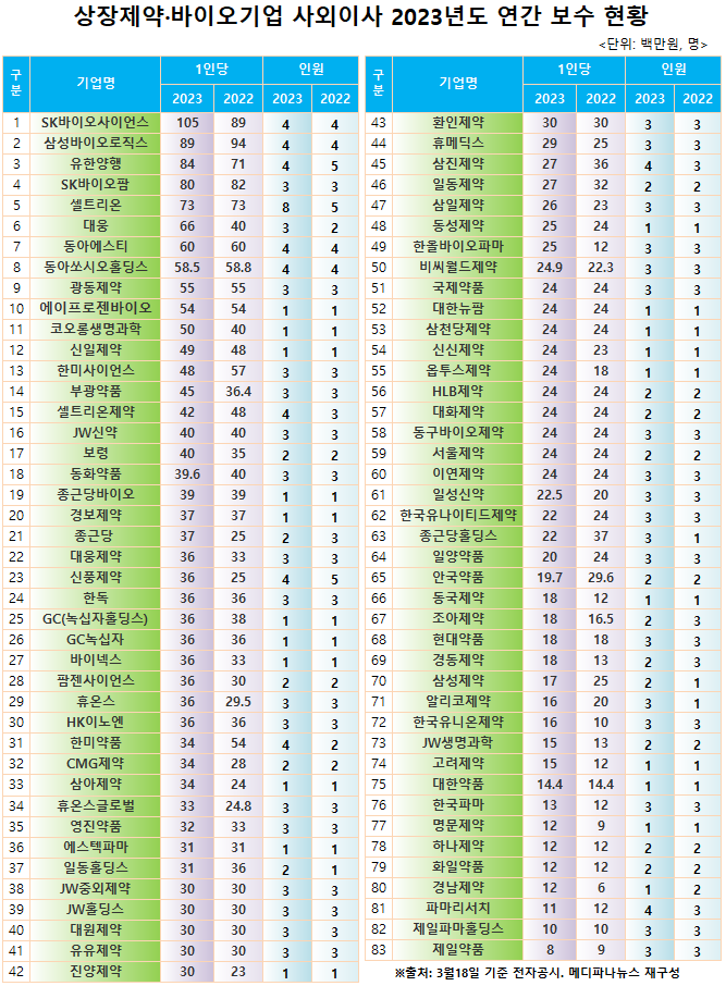 메디파나뉴스가 83개 상장제약사(지주사와 일부 바이오기업 포함)를 대상으로 '2023년도 사외이사 연간 보수 현황`을 집계한 결과, 업체당 연간 평균 3,264만원을 지급해 전년도에 비해 4.2% 가량 증가했다.