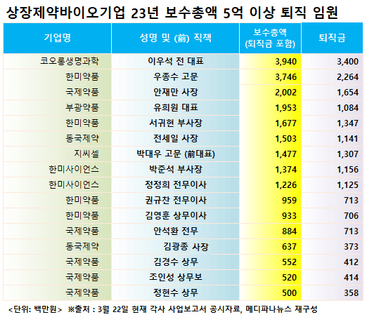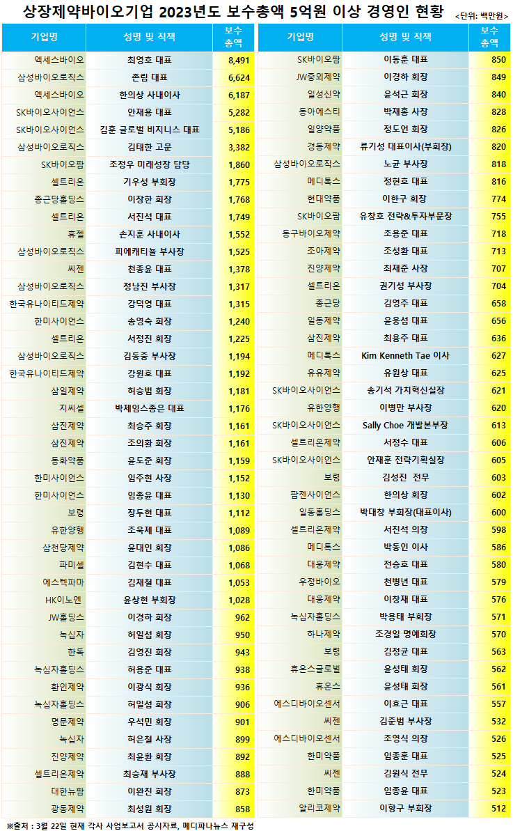 메디파나뉴스가 지난 22일까지 사업보고서를 공시한 제약·바이오기업을 대상으로 '보수지급금액 5억원 이상 개인별 보수현황'을 집계한 결과로, 이들 중에 퇴직금을 포함했거나 주식매수선택권 행사에 따른 이익금이 포함된 인사들의 명단은 가급적 집계에서 제외했다.