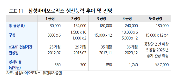 그러나 향후 2025년 이후 생산능력은 론자가 79만L, 삼성이 제5공장 완공 및 2026년 하반기 상업화 가동으로 78만L로 비슷한 수준이 될 것으로 전망되며, 우시는 싱가폴 생산 공장 신규 가동으로 60만L 생로 생산능력이 확대될 것으로 예상된다.