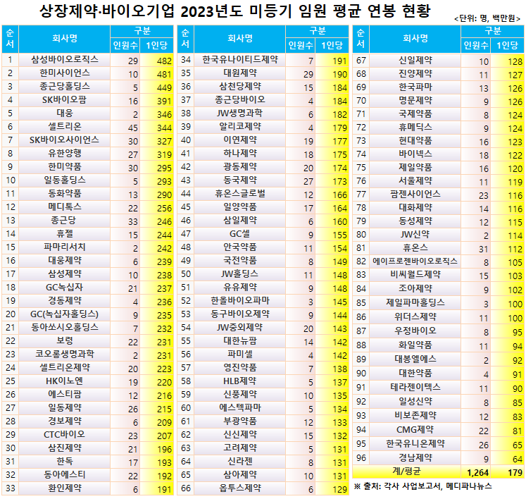 SK바이오팜(16명) 3억9100만원, 대웅(2명) 3억4600만원, 셀트리온(45명) 3억4400만원, SK바이오사이언스(30명) 3억2700만원, 유한양행(27명) 3억1900만원 등 5개사가 3억원대를 주었다.