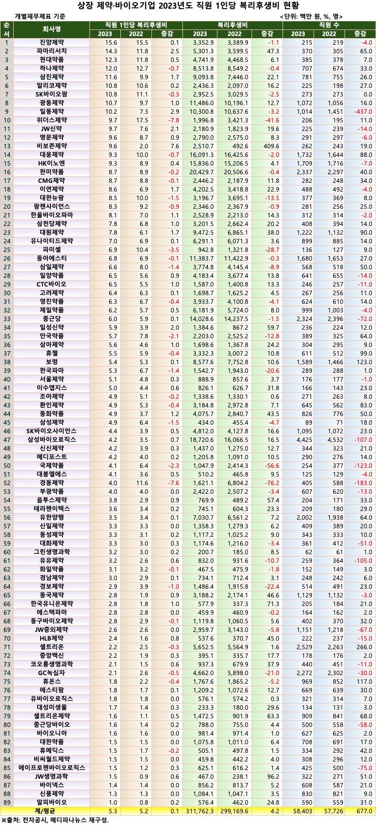 메디파나뉴스가 89개 상장 제약·바이오기업을 대상으로 집계한 '2023년도 직원 1인당 복리후생비 현황' 자료에 따르면 이들 기업은 지난해 복리후생비로 3118억 원(개별재무제표 기준, 판관비 상 복리후생비만 반영)을 지출, 전년 대비 4.2% 증가했다.