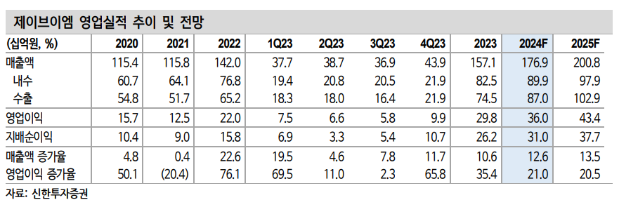 최승환 연구위원은 "MENITH의 매출 기여가 본격화하고, 하반기부터 신규로 블리스터카드형 장비의 매출 확대가 기대된다"고 밝혔다. 이어 제이브이엠의 2024년 실적 예상치로 매출액 1769억 원, 영업이익 360억 원, 영업이익률 20.4% 증가를 전망했다.