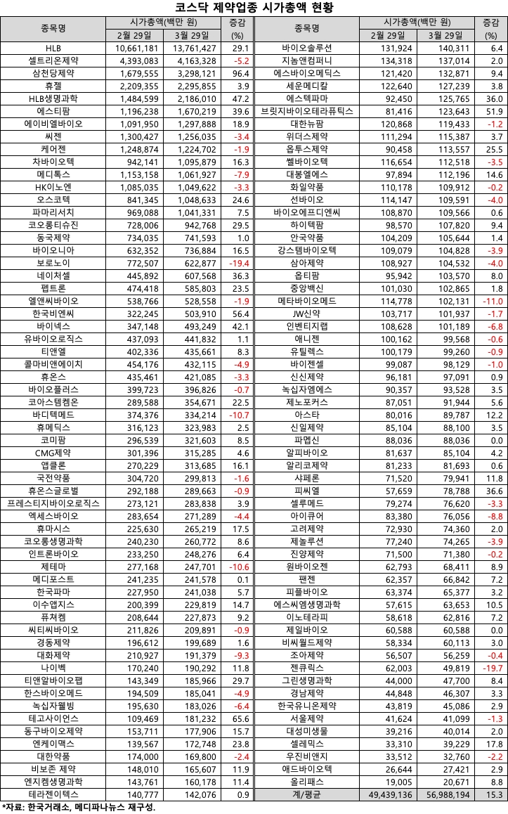 종목별로 살펴보면 HLB가 2월 29일 10조6612억 원에서 3월 29일 13조7614억 원으로 29.1% 증가했다. 올들어 HLB는 1월 35.0%, 2월 20.5%, 3월 29.1%의 성장률을 기록 고공행진을 이어가고 있다.