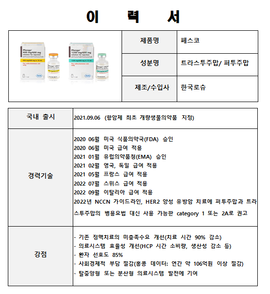 국내에서도 기존 HER2 양성 유방암의 표준요법(트라스투주맙+퍼트주맙) 치료 시간을 최대 90% 단축시키며, 피하주사 제형으로 환자 편의성을 개선했다는 점을 인정받았는데요. 2021년에는 항암제 최초 '개량 생물의약품'으로 지정됐습니다.