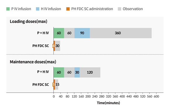 특히 전체 유방암의 20~25%에서 나타나는 HER2 양성 유방암은 공격적이며, 전이성 유방암으로 확산하며 재발할 가능성이 높습니다. 따라서 HER2 양성 유방암 환자들은 재발이나 전이를 예방하기 위한 항암요법이 필요해요. 하지만 기존의 정맥주사 요법은 3주마다 병원을 방문해야 하고, 투약 및 모니터링에 총 270분(4시간 30분)이 소요 된다는 미충족 수요가 있었습니다.
