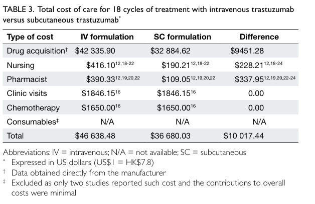 또한 홍콩에서 진행된 연구에 따르면 허셉틴 피하주사 제형의 사회경제적 부담 절감 효과는 더욱 극적이었습니다. 모든 HER2 양성 환자가 정맥주사 대신 피하주사 제형으로 치료했다고 가정했을 시, 18주기 동안 치료한 후 약물 획득 비용과 의료 전문가 시간 비용이 각각 9451.28달러(약 1260만원)와 566.16달러(약 75만원)이 감소해 연간 800만 달러(한화 약 106억 7,200만원)를 절감하는 것으로 나타났기 때문입니다.
