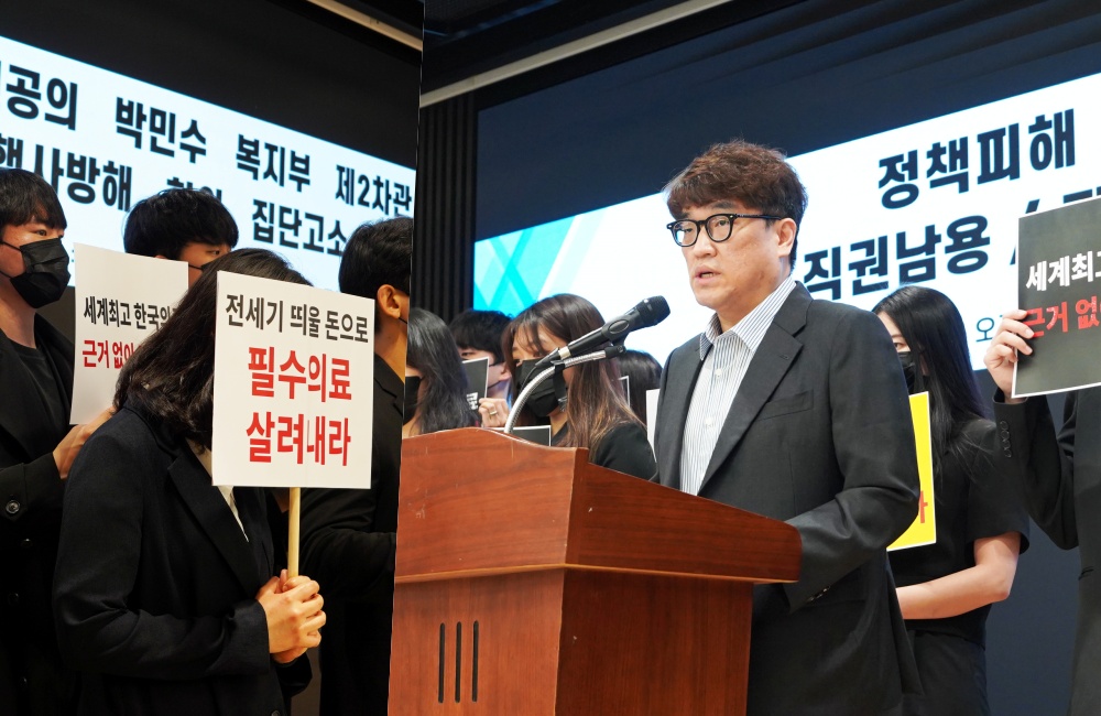 15일 사직 전공의 20여 명은 대한의사협회에서 기자회견을 열고 박민수 차관을 직권남용 혐의로 고소한다고 밝혔다.