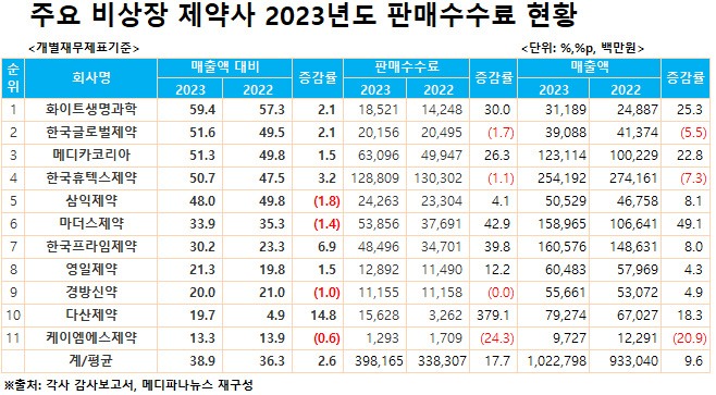이에 메디파나뉴스가 외부감사 대상 96개 비상장 제약사들의 2023년도 감사보고서를 통해 CSO에 제공되는 '판매수수료' 금액이 매출액 대비 10% 이상 지출한 11개사들을 종합한 결과, 평균 38.9%로 집계됐다. 이는 전기 36.3%에 비해 2.6%p 늘어난 비율이다.