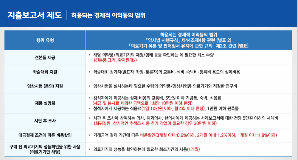 허용되는 경제적 이익 범위는 행위 유형별로 상이하다. 학술대회 지원비는 참가자(발표자·좌장·토론자)의 교통비·식비·숙박비·등록비 용도로만 실제비용 지급이 가능하다.