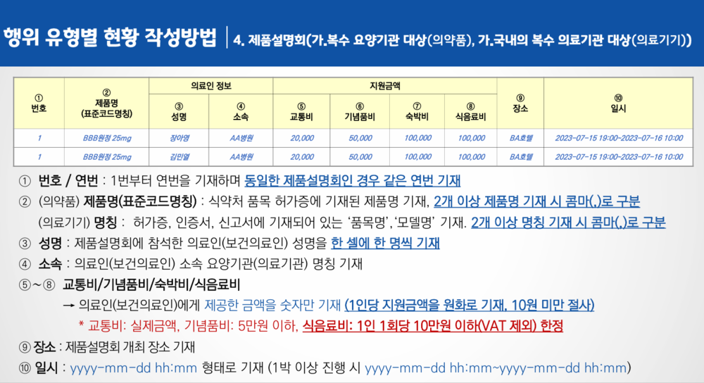 제품 설명회 명목으로 제공할 수 있는 비용은 참석자에게 제공하는 실제 비용의 교통비와 5만원 이하 기념품, 숙박, 10만원 이하 식음료비(1인 1회, VAT 제외)다.