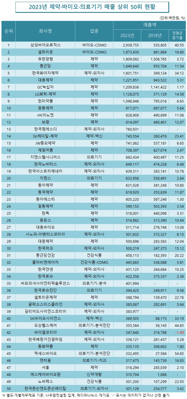 이를 연평균 증가율로 계산해보면, 제약·바이오·의료기기 업계 전반에 걸쳐 상위 50대 업체라는 입지를 유지하기 위해서는 매해 9.5%가 넘는 매출 증가율을 이어가야 한다는 계산이 나온다.