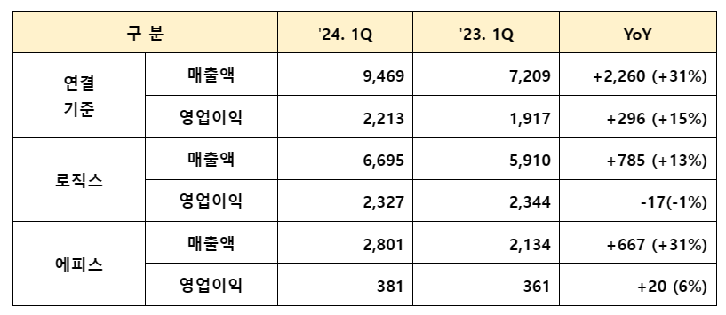 삼성바이오로직스가 24일 공시를 통해 2024년 1분기 연결기준 매출 9469억원, 영업이익 2213억원을 기록했다고 밝혔다. 전년 동기 대비 매출은 2260억원(+31%), 영업이익은 296억원(+15%) 각각 증가했다.