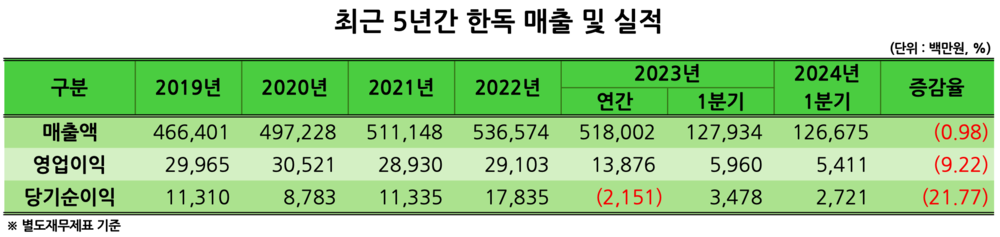 한독은 3일 공시를 통해 올해 1분기 별도기준 잠정 매출 1266억 7500만원, 영업이익 54억 1100만원을 기록했다고 밝혔다. 이는 전년 동기 대비 각각 0.98%, 9.22% 감소한 수치다.