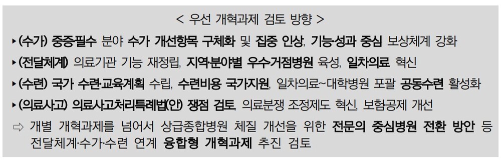 수련체계에선 국가 수련‧교육계획 수립, 수련비용 국가지원, 일차의료~대학병원 포괄 공동수련 활성화 등이 우선 추진된다.