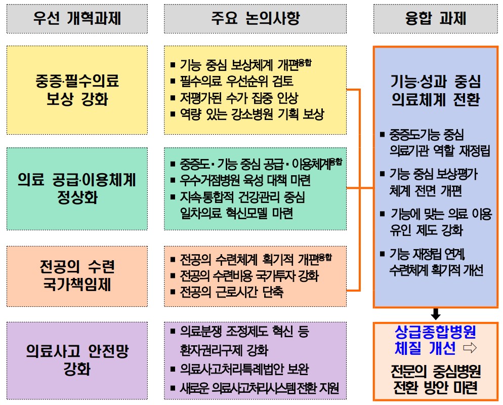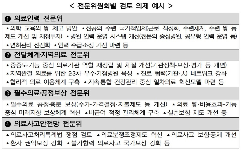 4개 전문위는 전문의 중심병원, 중증·기능 특화병원 역할 재정립, 필수의료 보상 개선, 의료사고처리특례법 쟁점 등 외에도 여러 의제를 각각 심층 검토하게 된다.