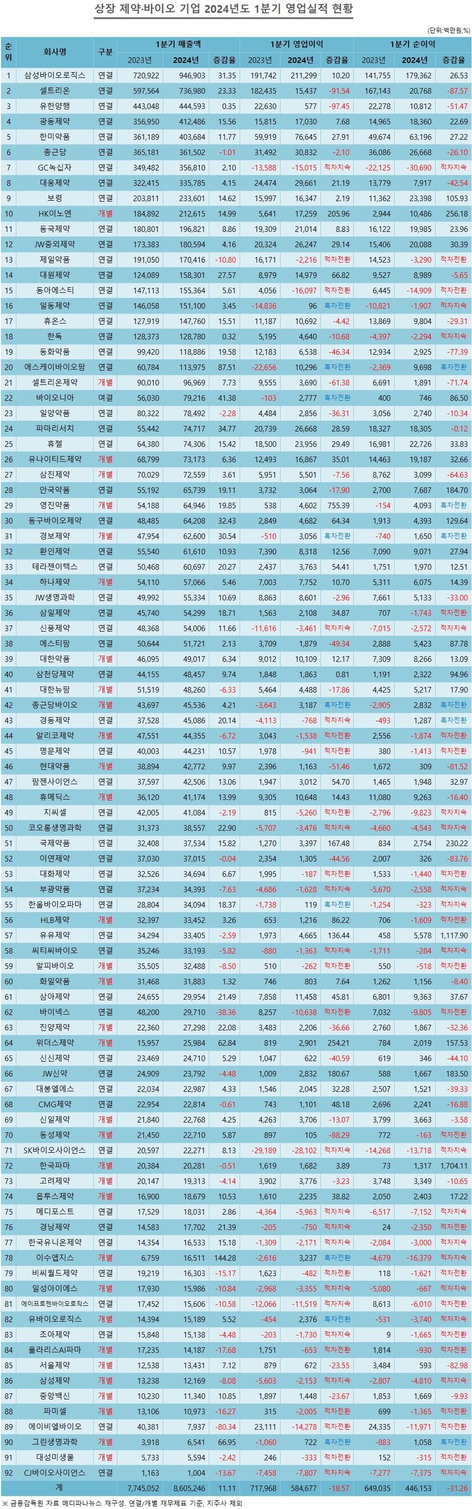 메디파나뉴스가 92개 상장 제약·바이오기업 연결·개별 재무제표 기준 2024년도 1분기 실적을 집계한 결과, 총 매출액은 8조6052억원으로 전년 7조7450억원 대비 11.11% 증가했다.