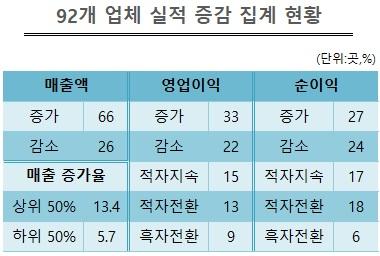 92개 중 영업이익이 늘어난 업체는 33곳으로 약 3분의 1 수준이었다. 흑자전환도 9곳이었다. 이에 반해 영업이익 감소 22곳, 적자지속 15곳, 적자전환 13곳 등 영업이익에서 부진을 겪은 업체 수는 총 50곳으로 절반을 넘었다.