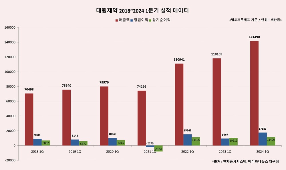 대원제약이 16일 금융감독원 전자공시시스템에 공개한 2024년도 1분기 실적에 따르면, 별도재무제표 기준 매출액은 1414억9000만원으로 역대 최대치를 기록했다. 전년 동기 매출액인 1181억6900만원과 대비하면 19.7% 상승한 수치다.