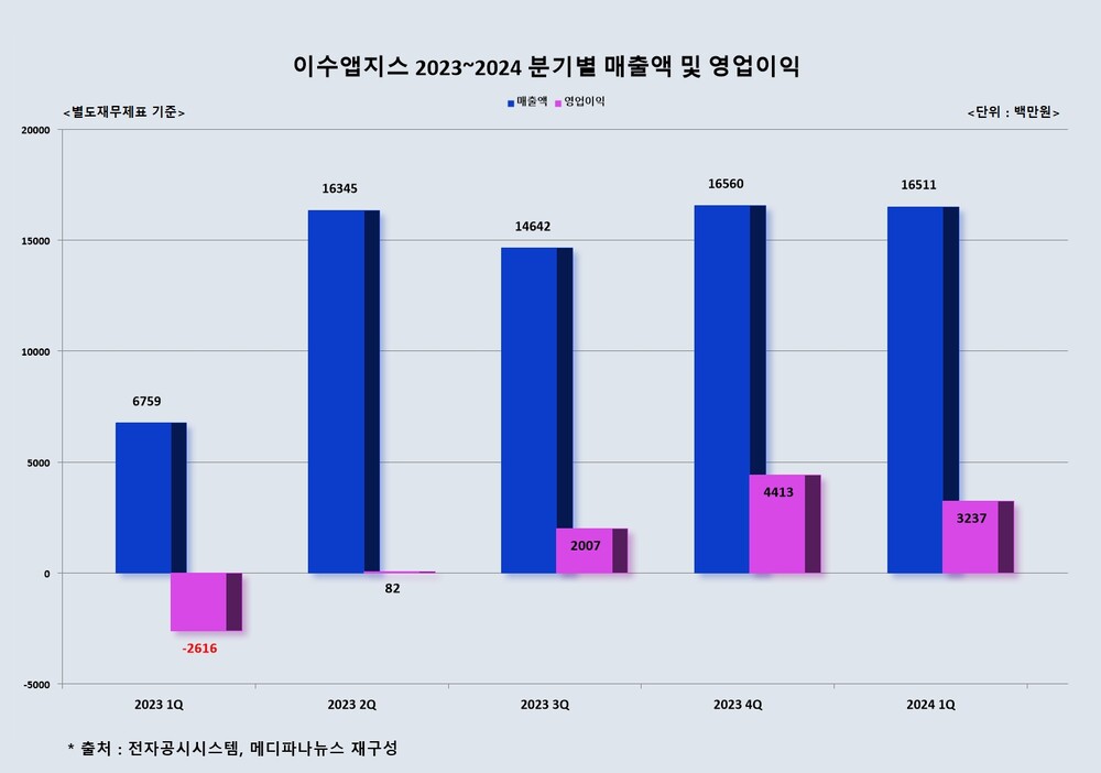 기업공시 및 IR 자료에 따르면, 이수앱지스는 올해 1분기 매출액이 165억1100만원으로 전년 동기 67억5900만원 대비 144.3% 상승했다. 영업이익은 32억3700만원으로 마이너스 26억1600만원이었던 전년 동기 대비 흑자전환을 이뤘다.