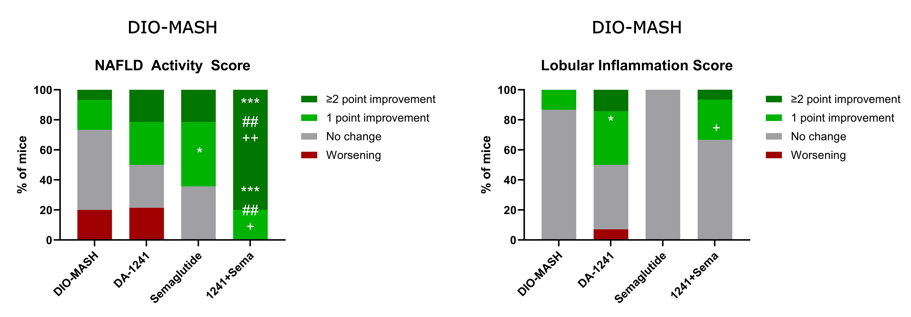 대사 이상이 있는 식이 유발 MASH 마우스 모델에서 8주간 DA-1241과 세마글루타이드를 함께 투여받은 마우스는 모두 NAS(NAFLD Activity score, 지방간 활성도 점수)가 1점 이상 개선되었으며, 80% 이상의 개체에서 2점 이상의 개선효과를 보이는 우수한 약효를 나타냈다.